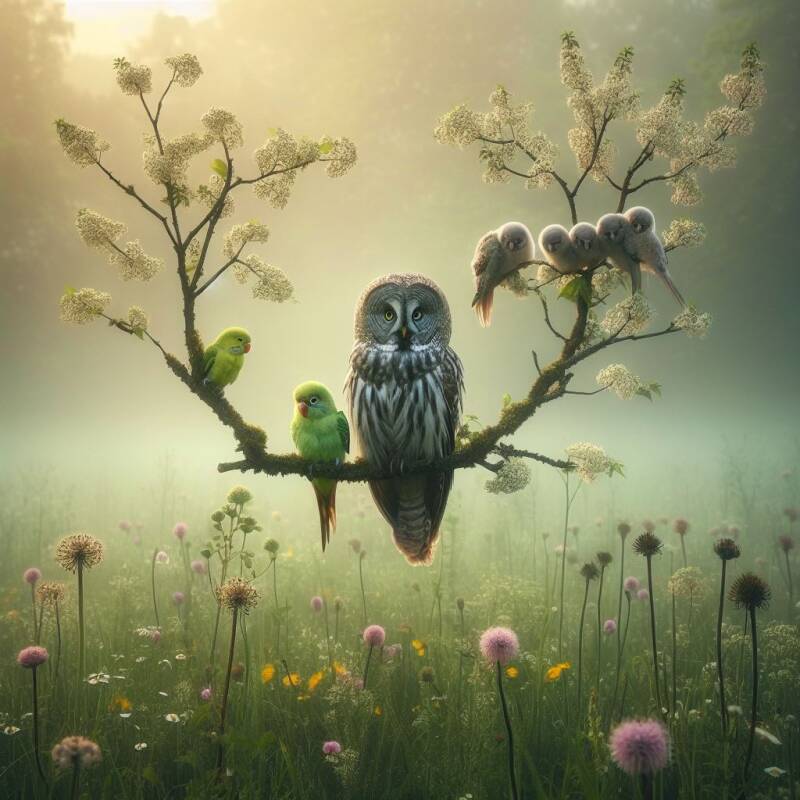 Neben nebligen Nieselwiesen nisten nicht selten neugierige Nachteulen - schläfrig nickend - auf nassen Zweigen, während nebenan der Nachbar-Nymphensittich dem nervenden Nachwuchs lautlos nachgibt.
