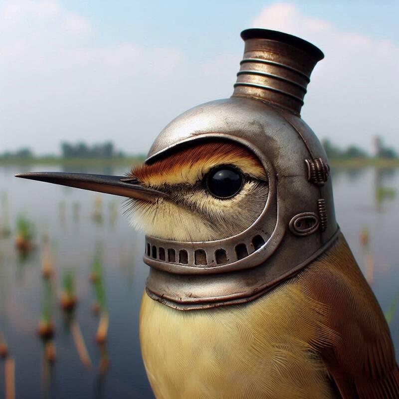 Singsang sorgfältig generiert mit Copilot nach dem Prompt: Ein Teichrohrsänger trägt an Stelle eines Schnabels ein Ofenrohr im Gesicht...